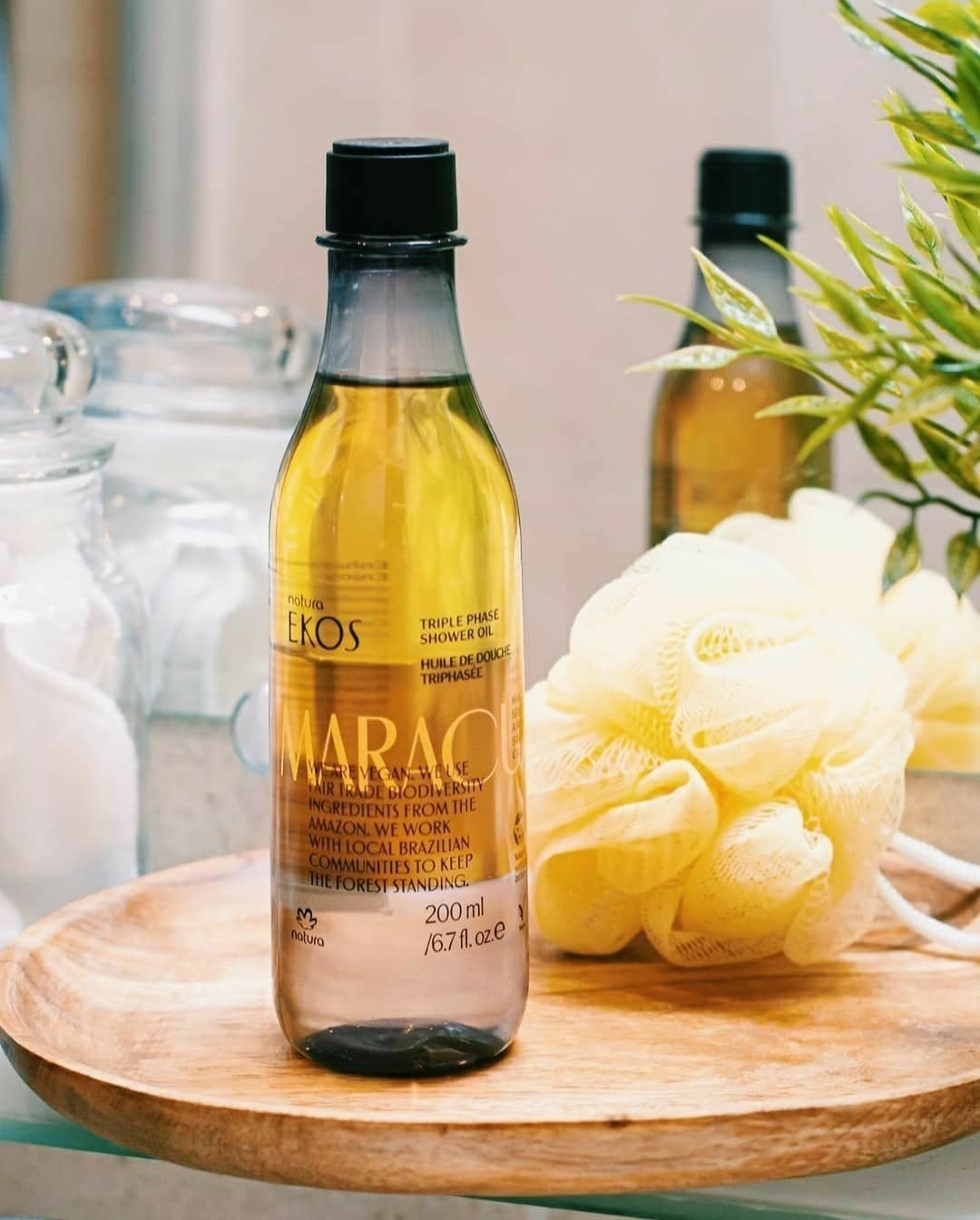 Es un aceite de ducha trifásico con ingredientes de maracuyá de comercio justo, provenientes de la Amazonía.